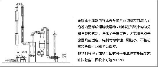 ▲干燥強(qiáng)度大、設(shè)備投資省、蒸發(fā)能力大,可從50kg/h~2000kg/h; ▲干燥時(shí)間短,適用于熱敏性物料,成品不與外界接觸,無(wú)污染,質(zhì)量好; ▲設(shè)備成套提供,熱源可選擇蒸汽加熱或配套使用燃煤、燃油、燃?xì)鉄犸L(fēng)爐等。 ▲基本型氣流干燥設(shè)備,適用于松散狀、粘性小、成品為顆粒及粉末的物料。此流程示意為負(fù)壓氣流干燥,用戶可根據(jù)產(chǎn)品特性選擇正壓形式的干燥方法。 工作原理 ![]()